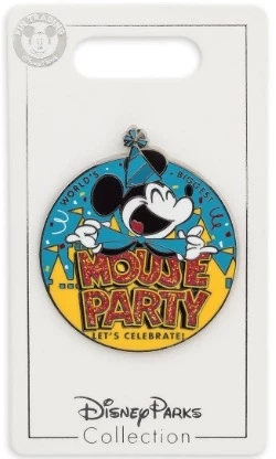Join in the celebrations as Mickey hosts the ”World’s Biggest Mouse Party” at the Disney Parks. This glittering pin features an excited Mickey tweaking his bow tie while its glittering detailing adds sparkle to the festivities.