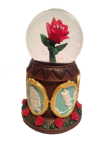 This Beautiful Enchanted Rose Snow Globe will be sure to capture your heart. Features Belle’s Enchanted Rose in the globe, with raised sculpturing of Belle, Beast, Lumiere, Miss Potts, Chip, and Cogsworth Clock, with roses circling the base.