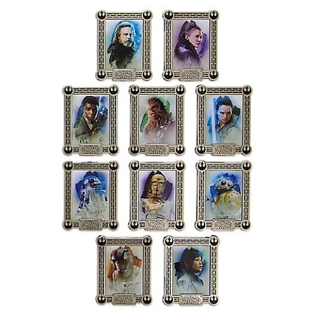 - The 10-pin collection includes: Luke Skywalker, Leia Organa, Finn, Chewbacca, Rey, R2-D2, C-3PO, BB-8, Poe Dameron, and Rose